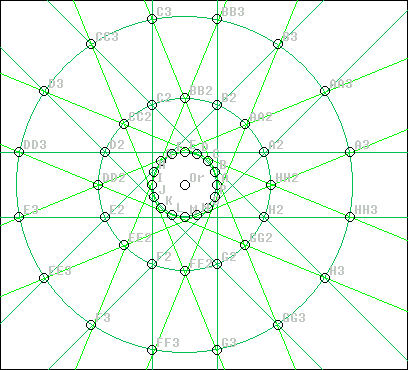The first ring has a diameter of period; in the second and third rings, consecutive points are separated by a distance period. The purpose of this set-up is to be able to easily call Arc() projections of same length (the period, or beat), all of them looking at the first circle from different point of view.